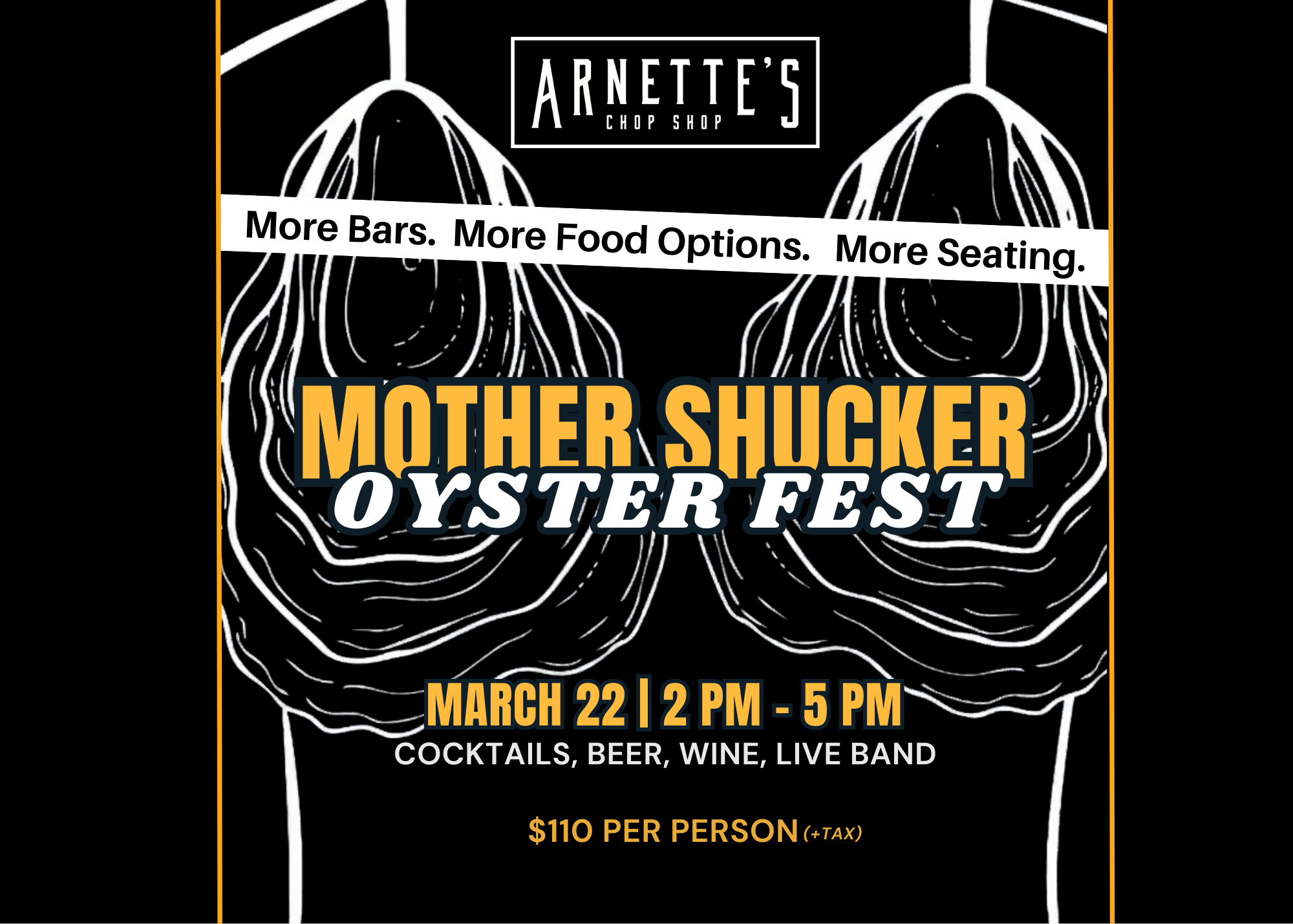Mother Shucker returns for an afternoon of oysters, cocktails, and live music in our courtyard and Garden Room. Enjoy raw oysters, Oyster Rockefeller, gumbo, crispy fish tacos, Bloody Maria shooters, and more — all included with your ticket. This year’s event features expanded food selections, additional bar stations, and increased seating to keep the party flowing. Join us for one of Arnette’s most anticipated annual celebrations. $110 per person, all inclusive.