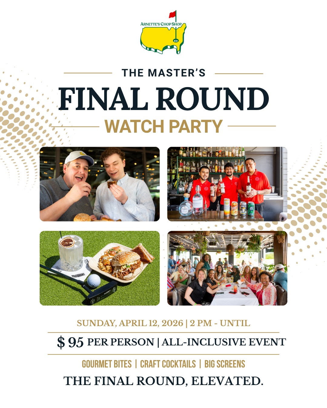 Join us at Arnette’s Chop Shop for our annual Master’s Final Round Watch Party—an elevated Sunday experience centered around exceptional food, classic cocktails, and a lively, social atmosphere. With everything included and TVs throughout the restaurant, this is the best way to experience the final round.
